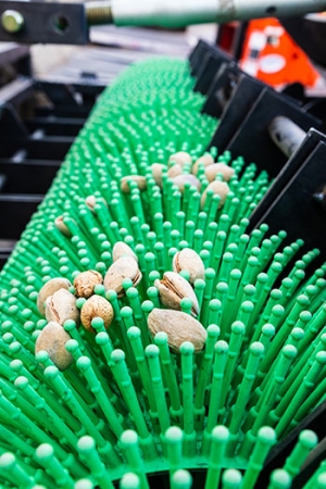 A brush-like harvester for almonds is designed to reduce dust.