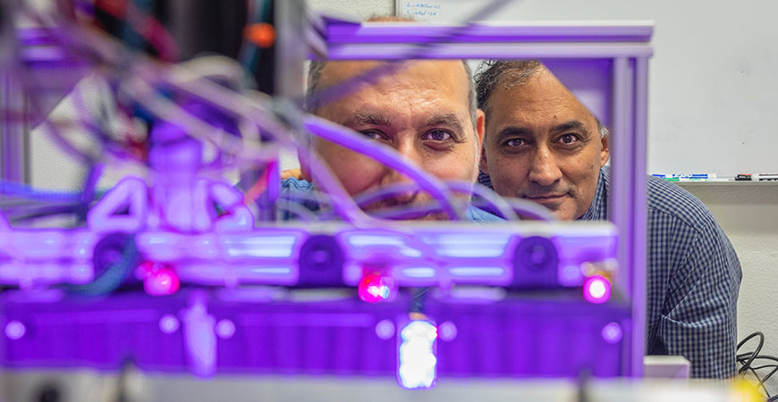 Professor Ehsani, right, and postdoctoral researcher Arash Toudeshki work on precision agriculture challenges in Ehsani's lab at Castle.