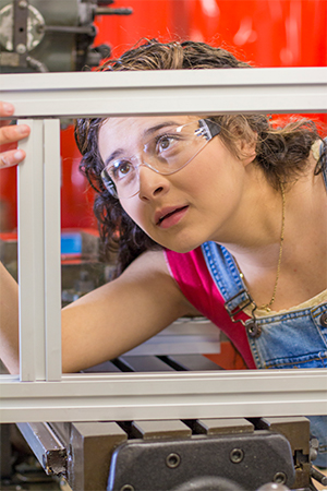 Student Marisol Prada works on a solar kiosk fabrication project in UC Merced's machine shop