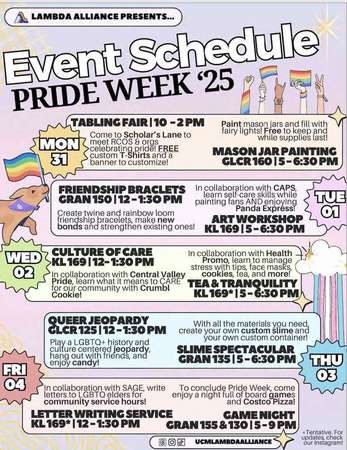 UC Merced's Lambda Alliance is continuing its tradition of hosting Pride Week from March 31 to April 4. Held each year in April, the week of events celebrates and advocates for the LGBTQ+ community at UC Merced, in the Central Valley and beyond.